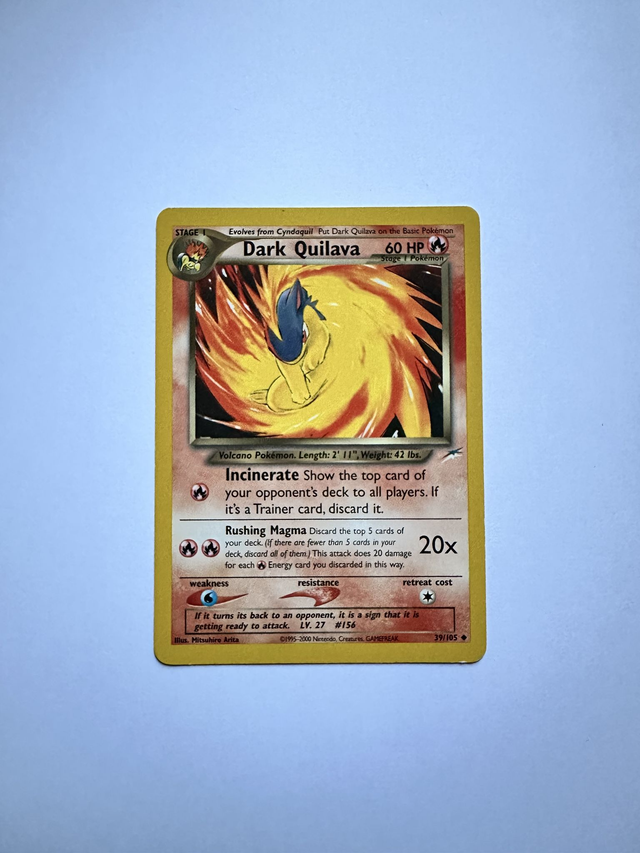 The fiery swirl artwork is pure early-2000s gold, and as a Dark Pokémon, it's a cool "evil" variant of the Cyndaquil line. Pairs great with your other Neo-era cards like Dark Exeggutor!